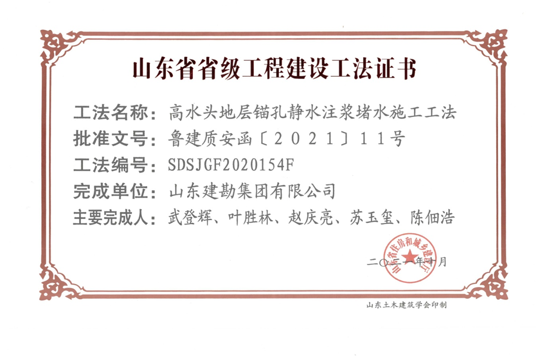 一、省级工程建设工法。为克服传统的锚孔突水注浆堵水工艺不足,山东建勘结合汇中大厦项目基坑支护工程现场实践经验进行了提炼创新,总结出了一种高水头地层锚孔静水注浆堵水施工工法,经省住房城乡建设厅组织评价,被确定为山东省省级工程建设工法。