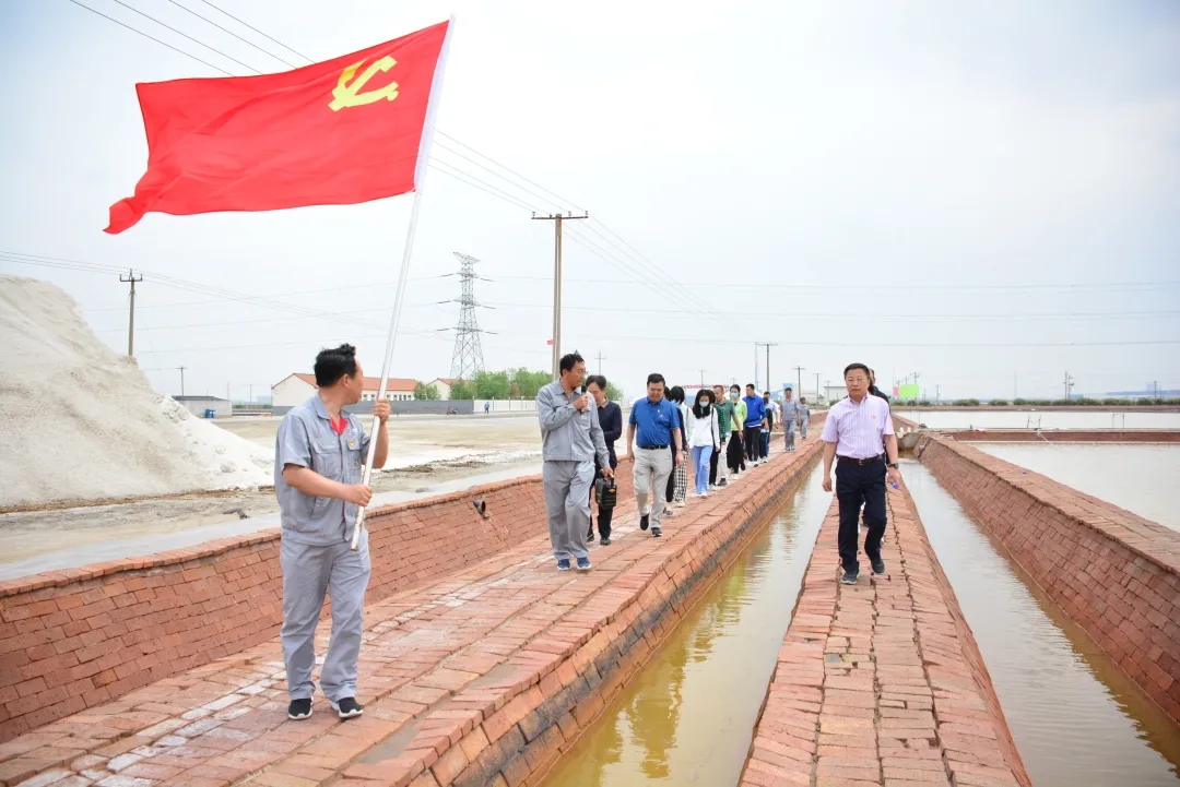 为扎实推进党史学习教育走深走实,全面激励党员干部发挥战斗堡垒作用,5月30日,山东江南所属鲁银投资组织总部全体人员60余人到鲁盐集团菜央子盐场,开展“党旗在盐田一线高高飘扬” 主题党日活动,在盐田现场接受了一场特殊而有意义的“沉浸式”学习教育。
