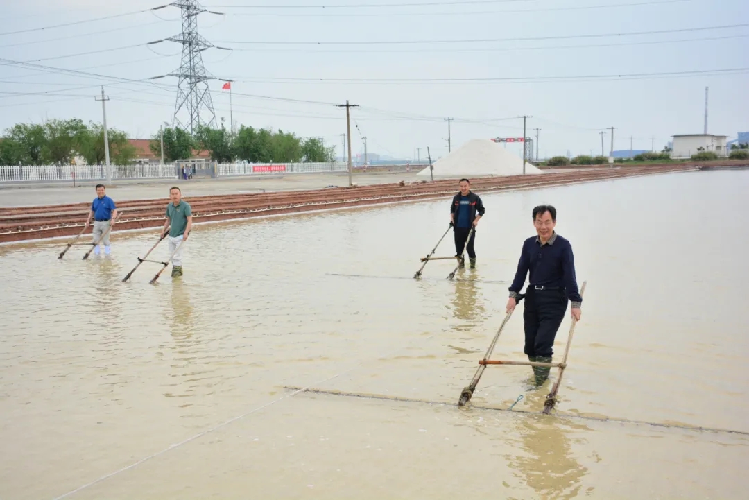 在鲁盐集团菜央子盐场原盐生产工区,“清水上垛,碧波变银山”的景象令大家赞叹不已。一工区副主任郝腾升现场为大家讲解了原盐生产工艺、生产流程;首届“鲁银工匠”杨建成为大家分享了制盐经验。总部职工们换上水鞋,拿着靶子,踏入盐田,现场体验了盐田活碴工艺和低钠盐捞盐生产工序,亲身感受盐场人的工作艰辛和丰收的喜悦。