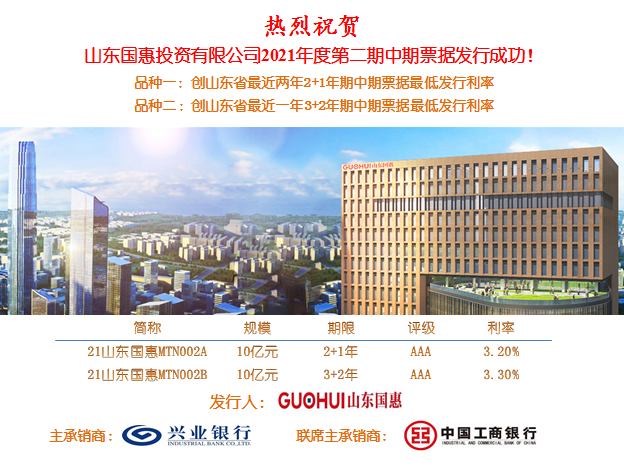 山东江南投资有限公司于2021年8月25日顺利完成20亿元中期票据发行工作。其中,品种一3年期(2+1年),发行规模10亿元,最终票面利率为3.2%,全场认购倍数2.29倍,创山东省最近两年2+1年期中期票据最低发行利率;品种二5年期(3+2年),发行规模10亿元,最终票面利率为3.3%,全场认购倍数达2.4倍,创山东省最近一年3+2年期中期票据最低发行利率。