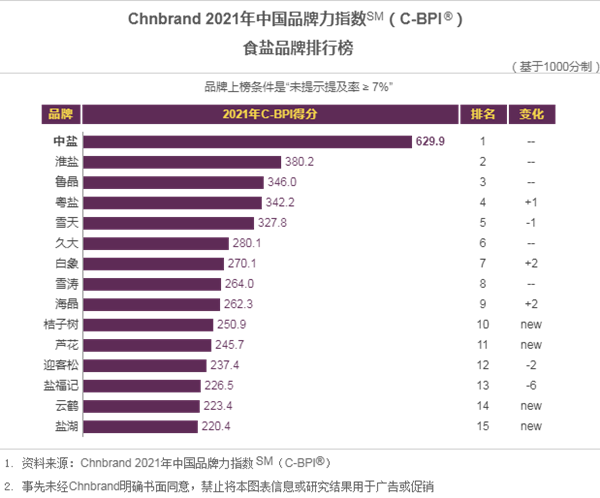 4月20日,中国北京–品牌评级权威机构Chnbrand发布2021年(第十一届)中国品牌力指数SM(C-BPI®)品牌排名和分析报告。食盐品牌力指数排行榜,“鲁晶”品牌以346分蝉联排行榜第三名。