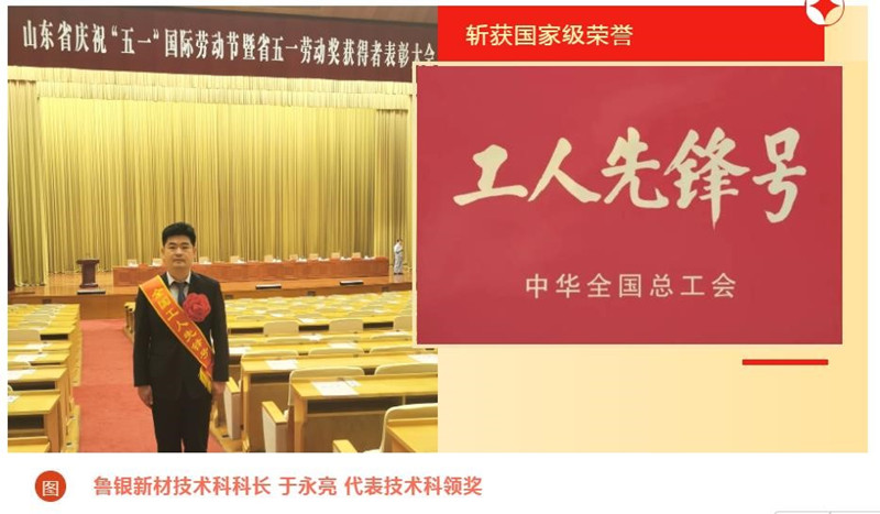 4月30日,山东省总工会在山东大厦召开山东省庆祝“五一”国际劳动节暨省五一劳动奖获得者表彰大会,山东江南所属鲁银投资鲁银新材技术科荣获 “全国工人先锋号”称号。
