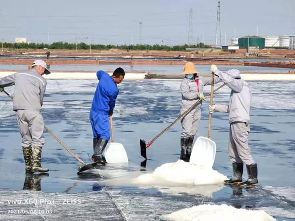 菜央子盐场精卤滩晒试验田捞出了第一茬精盐,该试验田面积28公亩,自灌池至收盐历时2天时间,捞盐5吨。天气不等人,面对捞盐人手紧张的局面,菜央子盐场生产管理部和人力资源部节日值守人员主动请缨,对口帮扶,全力保障试验田捞盐工作。面对收获的第一批优质试验品,在场人员内心都充满收获的喜悦。
